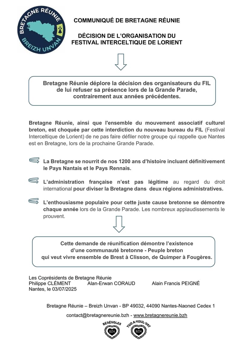 Par ailleurs, voici le lien de l’article paru dans Ouest-France Lorient sur le sujet, interview de Philippe Clément Coprésident : https://www.ouest-france.fr/festivals/interceltique/nous-ne-comprenons-pas-cette-decision-a-lorient-bretagne-reunie-privee-de-parade-interceltique-23eeffc6-54f4-11f0-acb7-473b370f0632